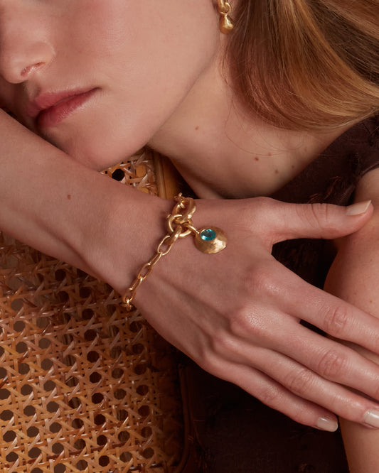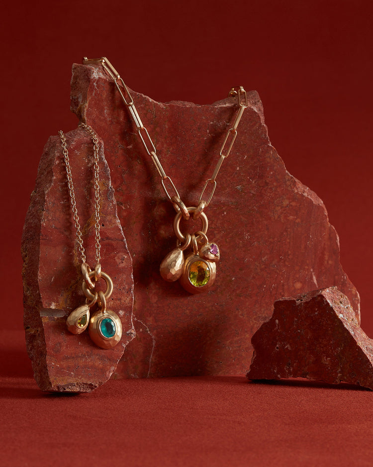 These motifs are available as charms in bold solid versions or enriched with colorful natural gemstones such as: purple amethyst, deep blue topaz, pink tourmaline, blue apatite, madeira quartz, and lemon quartz.