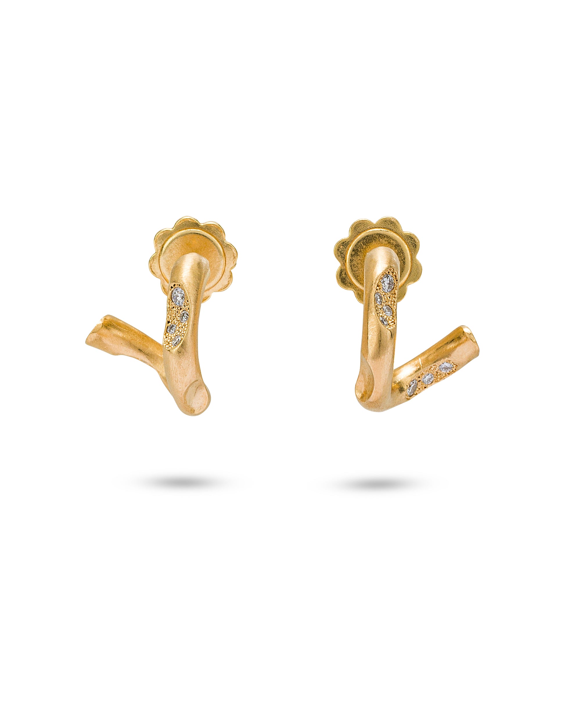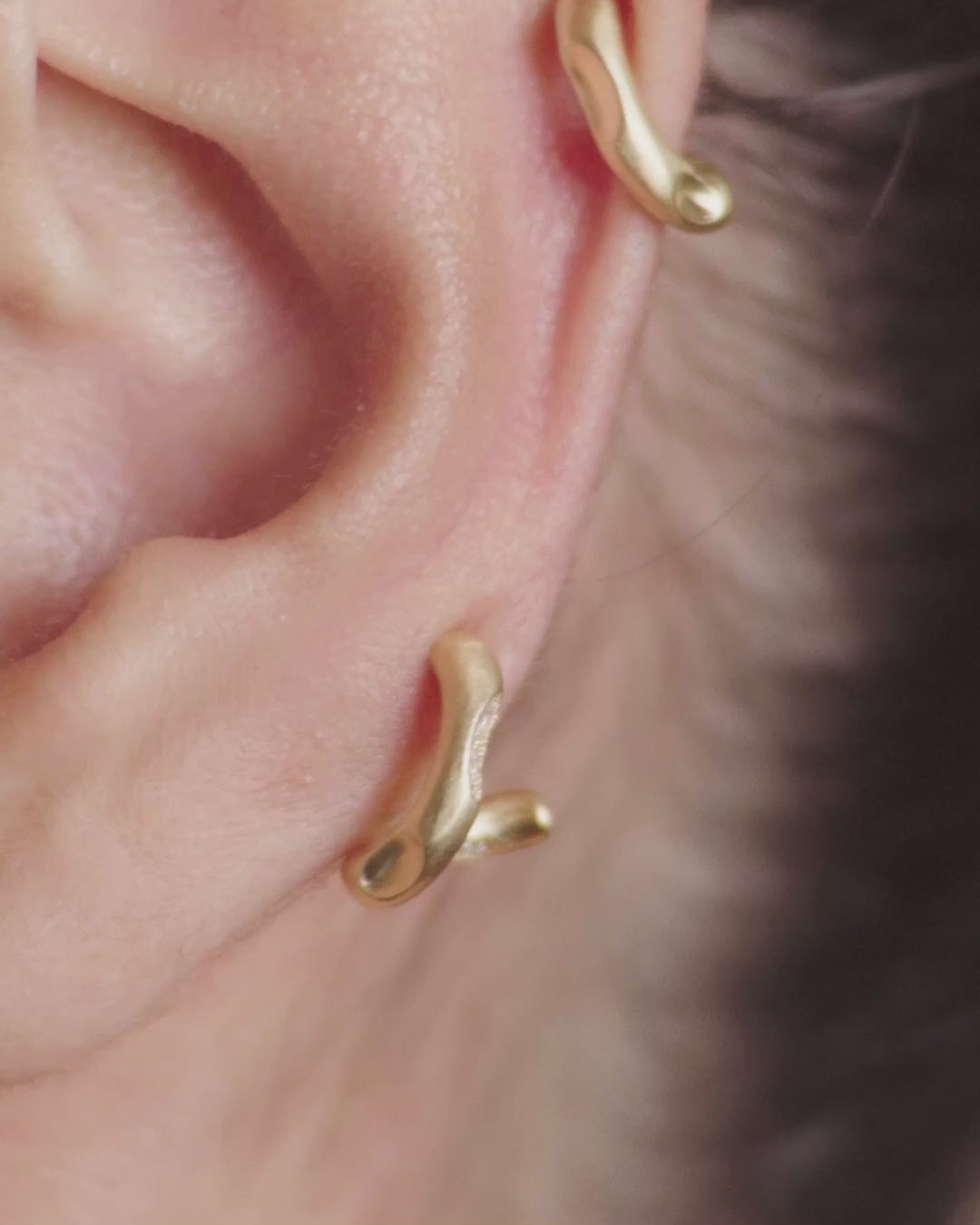 Orecchini Eden con Diamanti Naturali di 0,12 ct. Modello huggie dalla forma sinuosa, che abbraccia il lobo con un inaspettato twist finale, arricchito da luminosi micro pavé irregolari di diamanti. Design affascinante, caratterizzato da un gioco scultoreo di pieni e vuoti, che combina l'eleganza con un tocco di ironia. Il gioiello perfetto per chi ama distinguersi con stile. 100% Fatto a mano in Italia. Diamanti conflict-free, conformi al Kimberley Process.