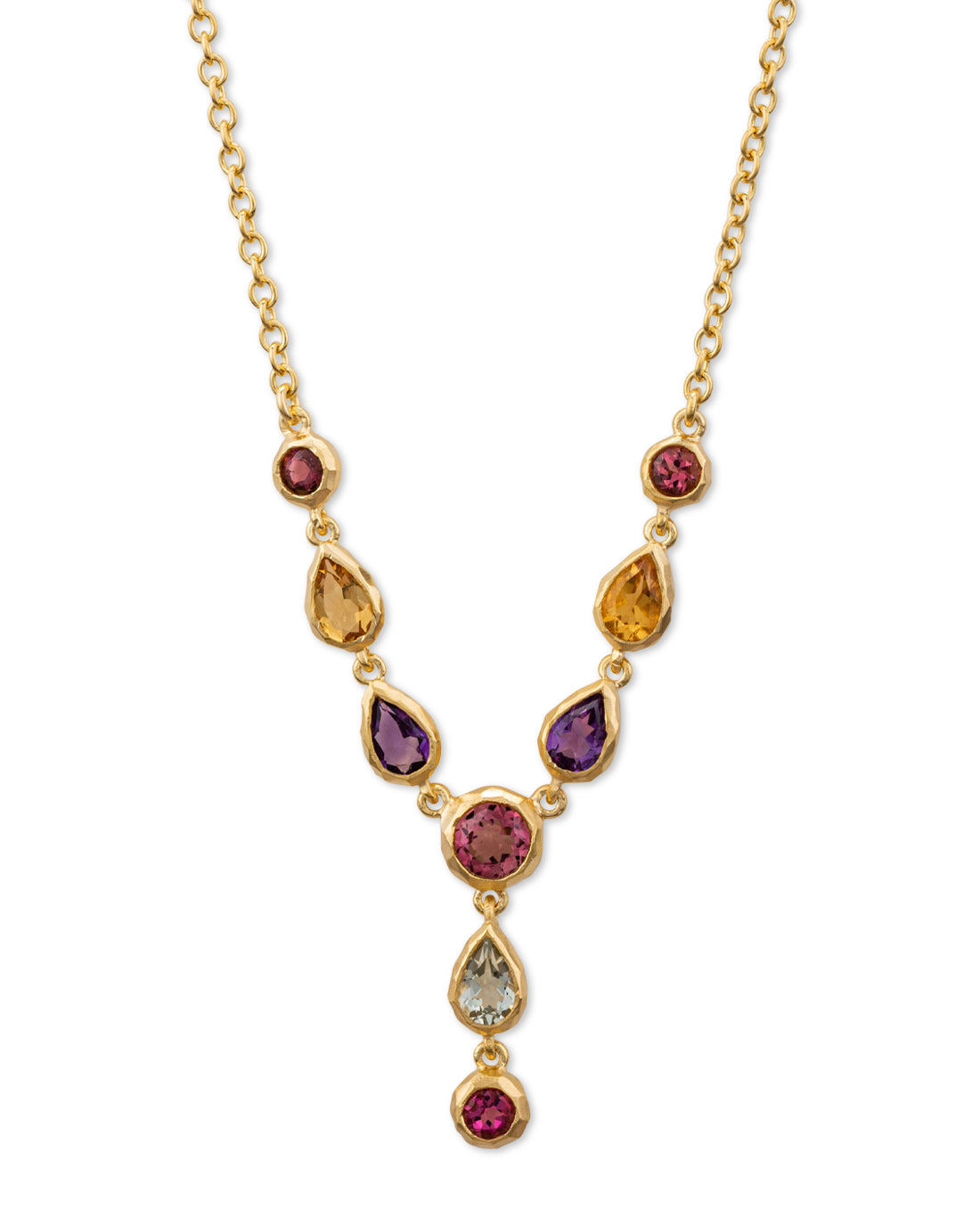 Drop Necklace with Natural Pink Tourmalines of 1.15 ct., Yellow Citrine Quartz of 0.8 ct., Purple Amethyst of 0.8 ct. and Light Green Prasiolite of 0.5 ct. Romantic and cultural design that can make a statement over a tank top as well as with a gown. A voyage inspired piece, adorned with playful bezels with faceted finish and a kaleidoscope of colors. 100% Handmade in Italy.