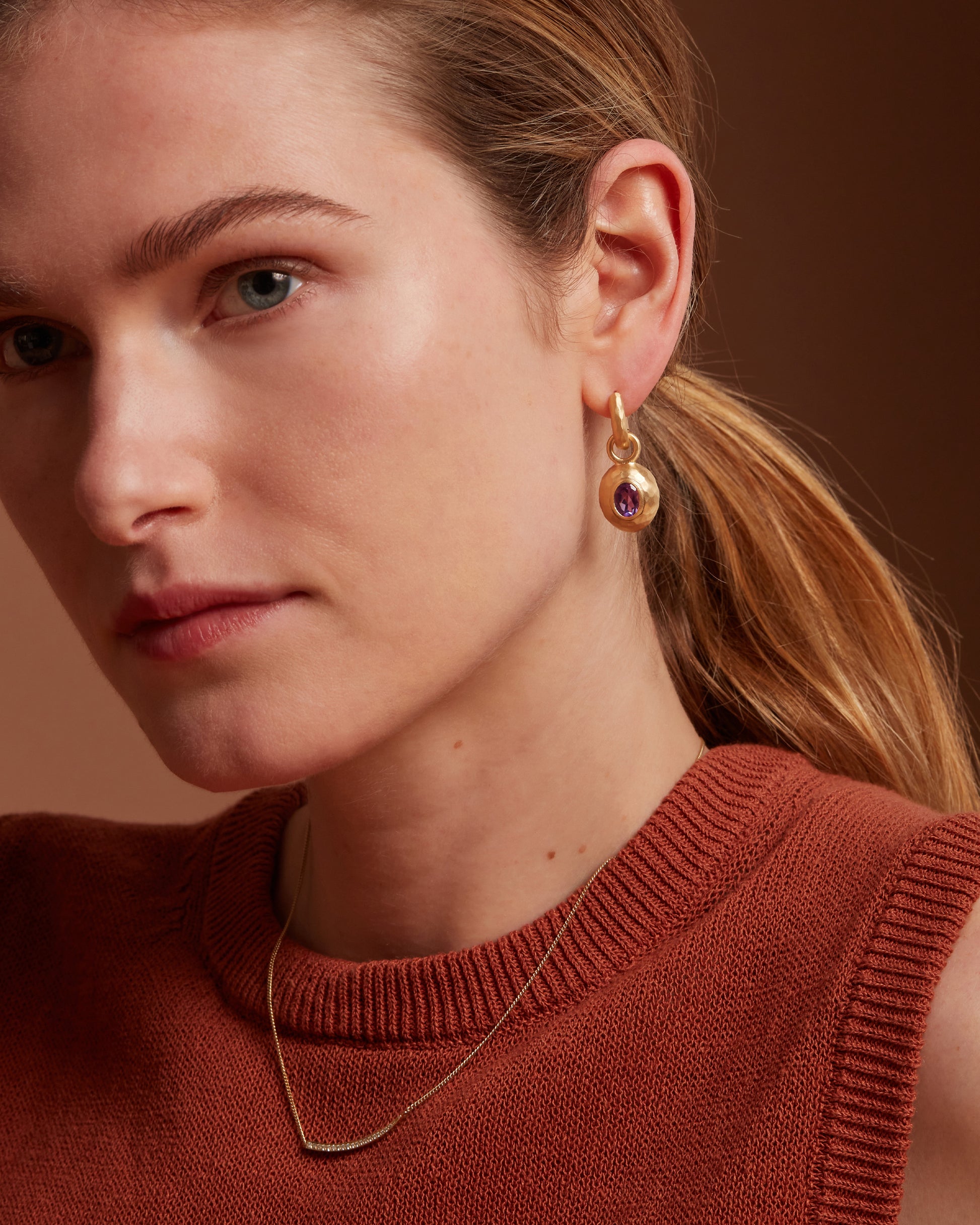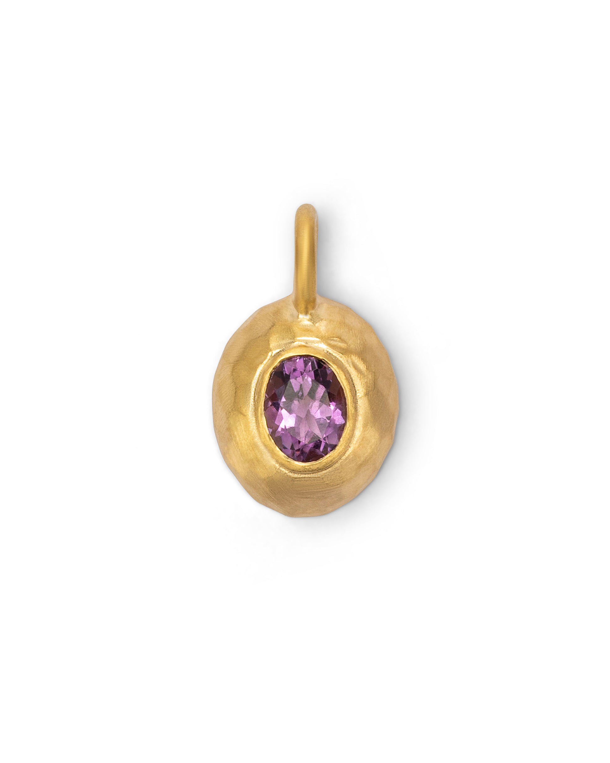 Milestone Sasso Charm Small with Natural Purple Amethyst of 1.1 ct. Graceful oval shape with artisanal hand-faceted finish. Paired with a peaceful stone that enhances intuition, spirituality and brings stability. Match with Earrings, Necklaces and Bracelets. Designed to and match with multiple charms. 100% Handmade in Italy.