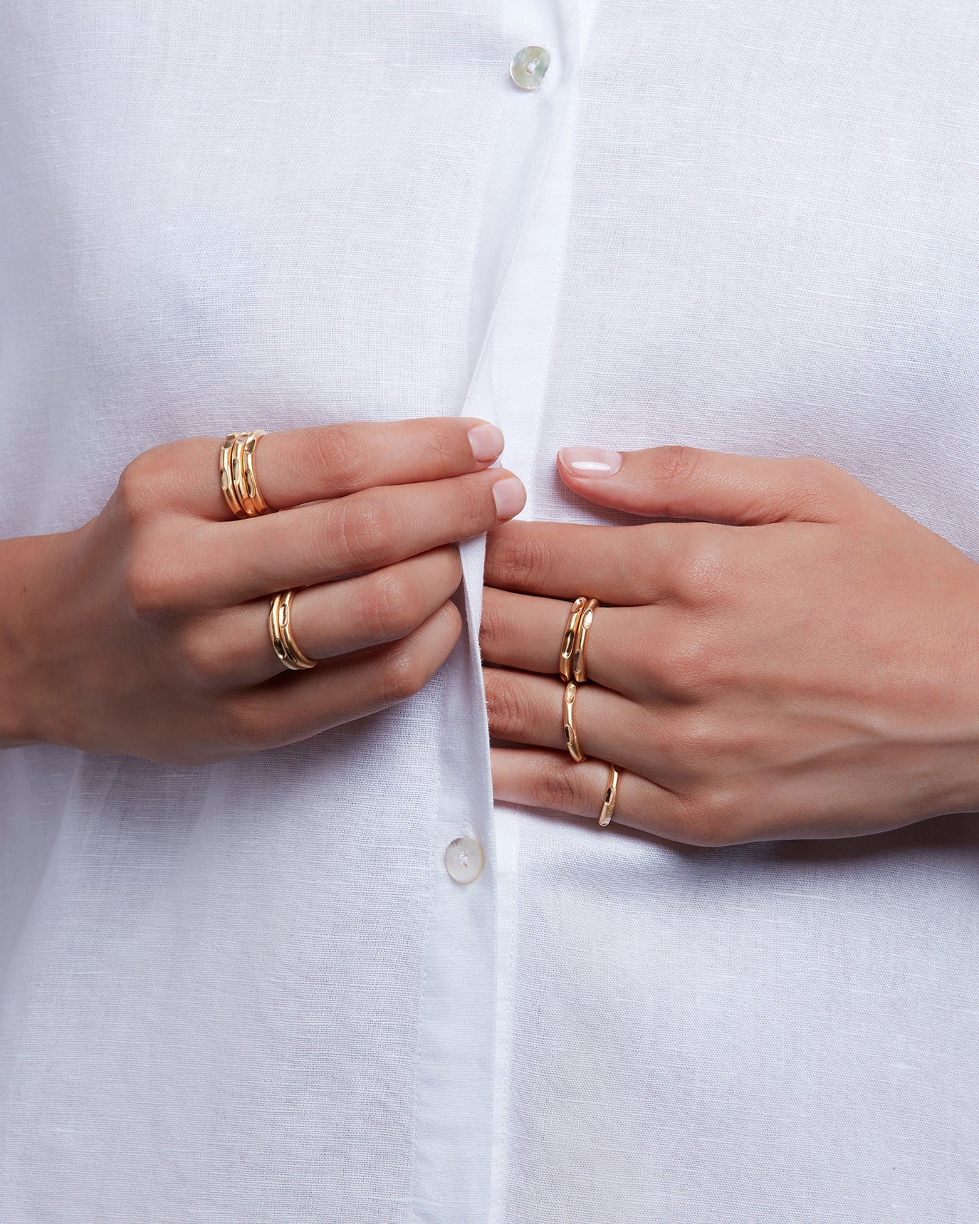 Mirage Ring, eclectic design with a minimal chic accent, featuring shiny dimples in different sizes contrasted with a matte-finish band. The fluidity of this jewel promotes calm and relaxation, allowing you to explore shapes without straining your eyes and mind. Ideal for stacking. 100% handmade in Italy.