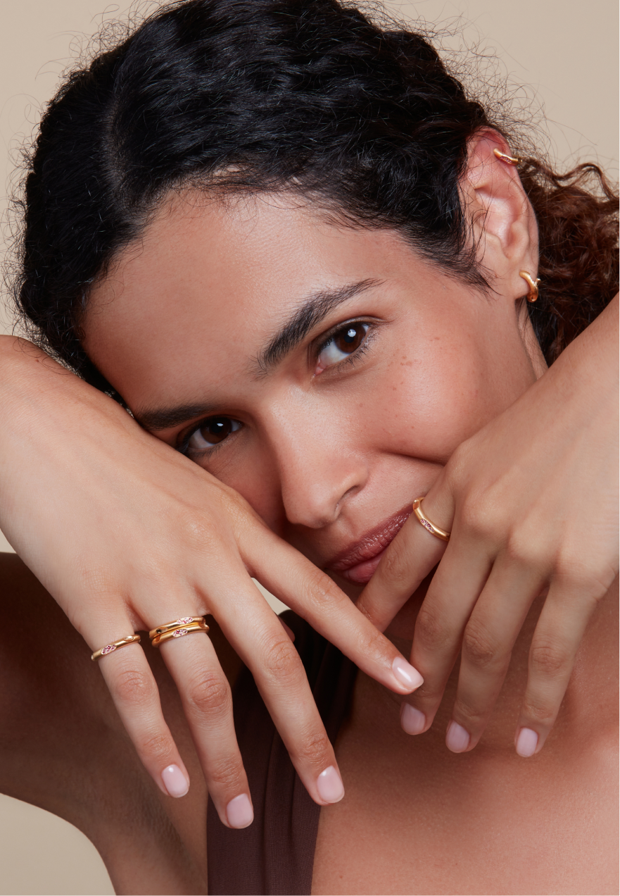 Oasis jewelry features sculptural shapes and luminous micro pavé of diamonds and sapphires, infusing style, and serenity to those who wear them.