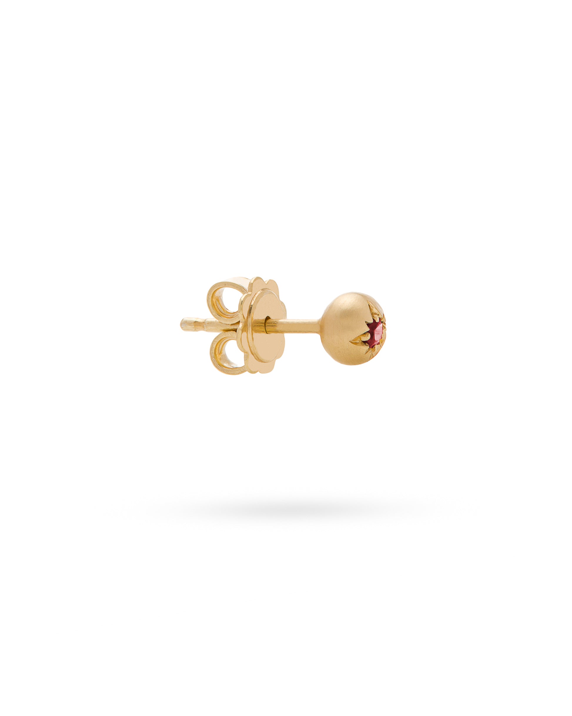 Moon Earrings with Natural Ruby of 0.08 ct. Round shape boule design with hand-engraved star. A style that reinterprets the classic baby studs with a sweet and cool twist to cherish forever. 100% Handmade in Italy.