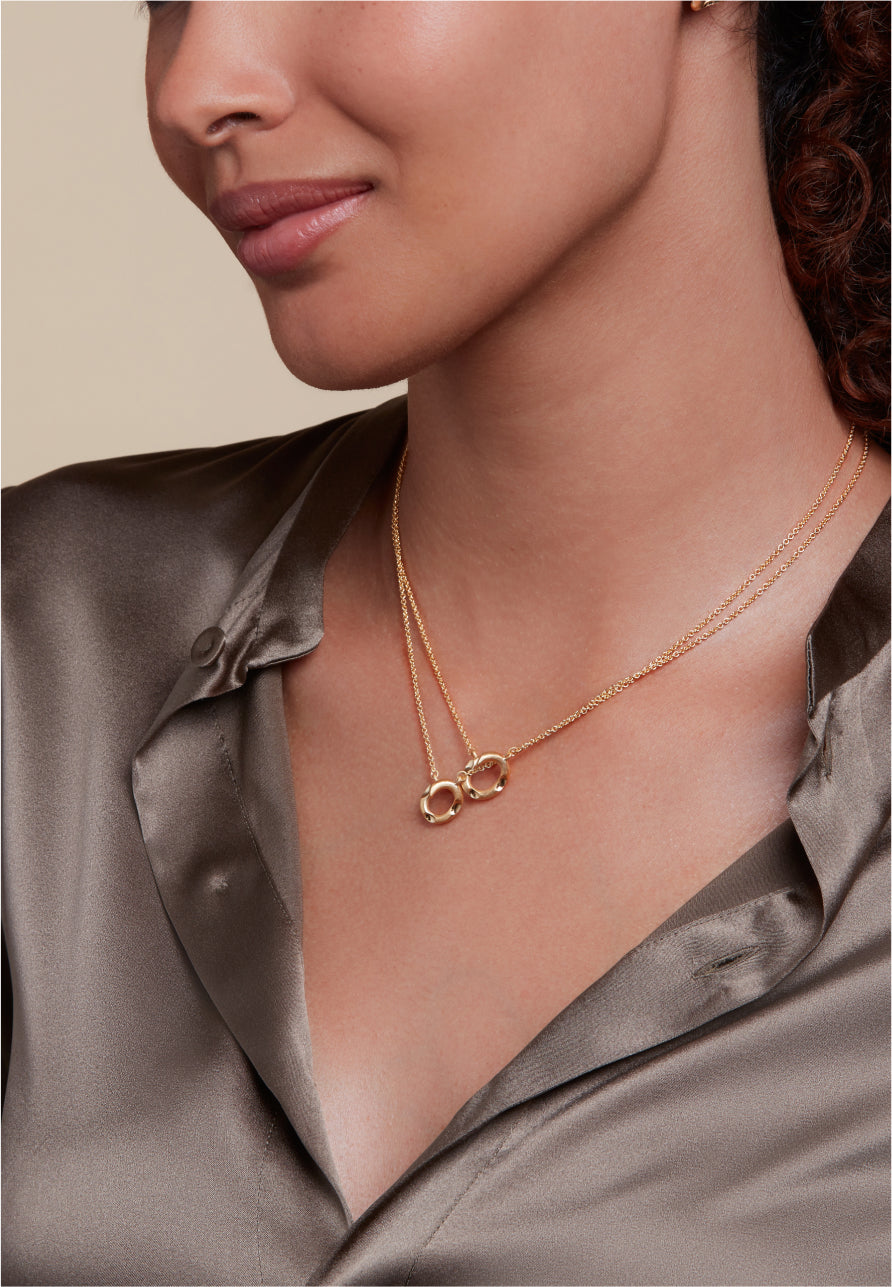 Oasis Radiance Necklace with Natural Diamonds of 0.09 ct. Featuring a precious pendant with fluid and sinuous shapes, enriched by three asymmetrical dimples adorned with shiny micro pavé of diamonds. Designed to reflect light from every angle, creating a captivating sculptural and sparkling effect. The perfect amulet to promote love, happiness, and serenity. 100% Handmade in Italy.