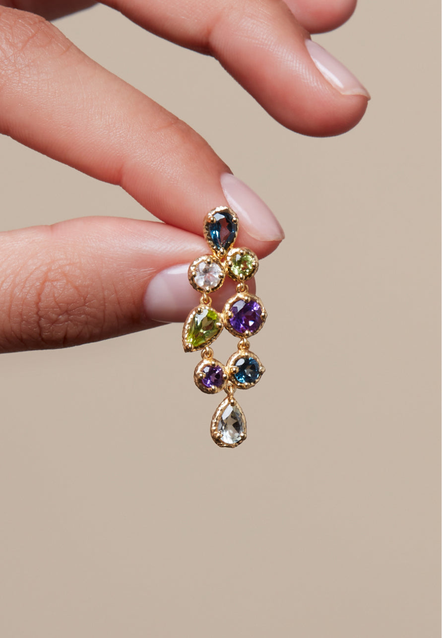 Complex goldsmithing techniques take center stage in this collection. Eclectic hand-faceted bezels are adorned with round and drop-cut stones, creating a truly special geometric interplay rich in colors. This unique aesthetic is reflected in the name Lorelai, which evokes the idea of irresistible charm.