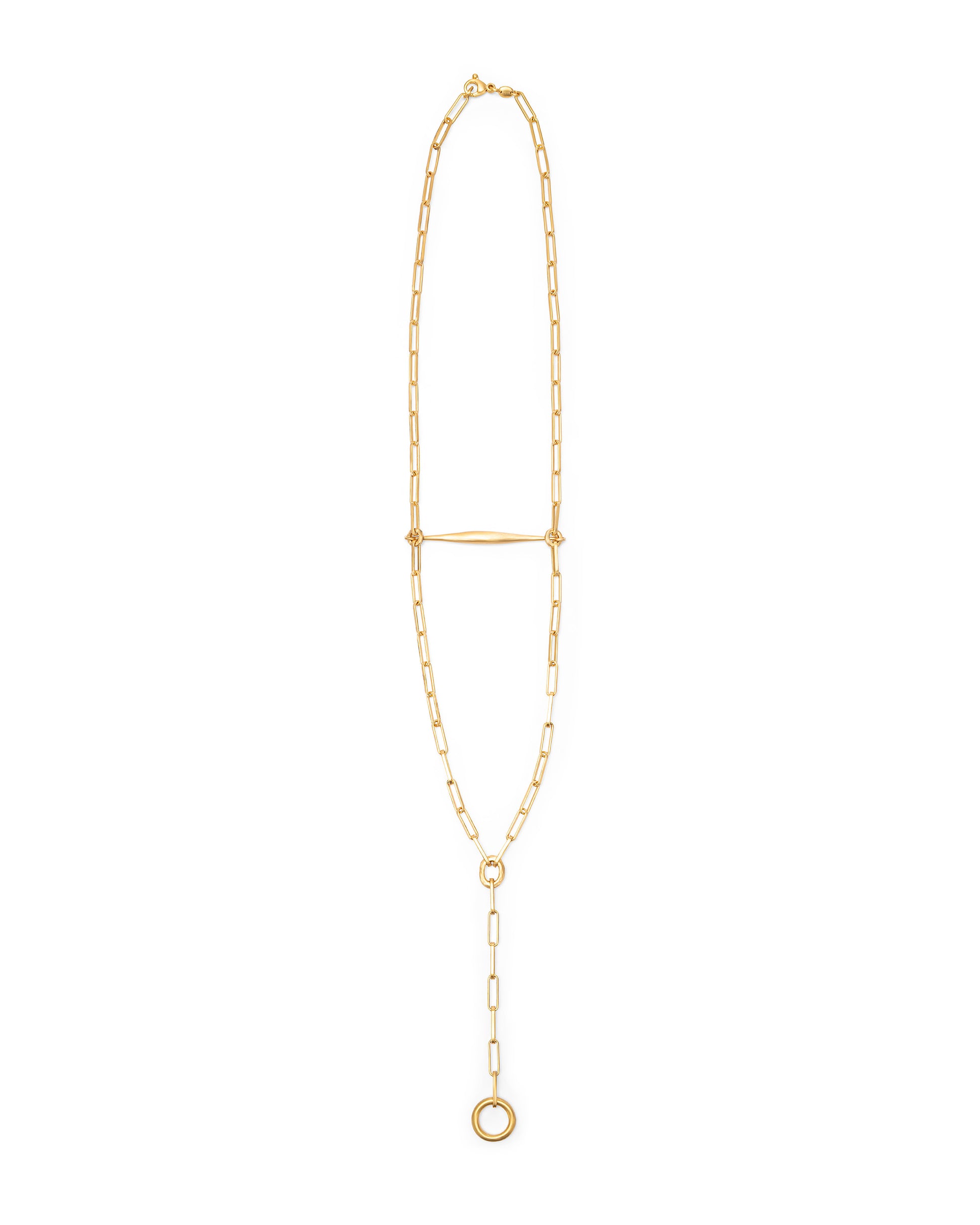 The Spindle Necklace Clip Chain features a striking Y silhouette that blends movement and structure. The spindle, an age-old symbol of feminine creativity and strength, is reimagined as a sleek, contemporary motif, hand-shaped to embody tenacity and resilience. A celebration of artisanal heritage and modern reinvention, it showcases a central faceted oval link and charm holder. Wear it clean, or elevate it with meaningful charms. 100% Handmade in Italy.