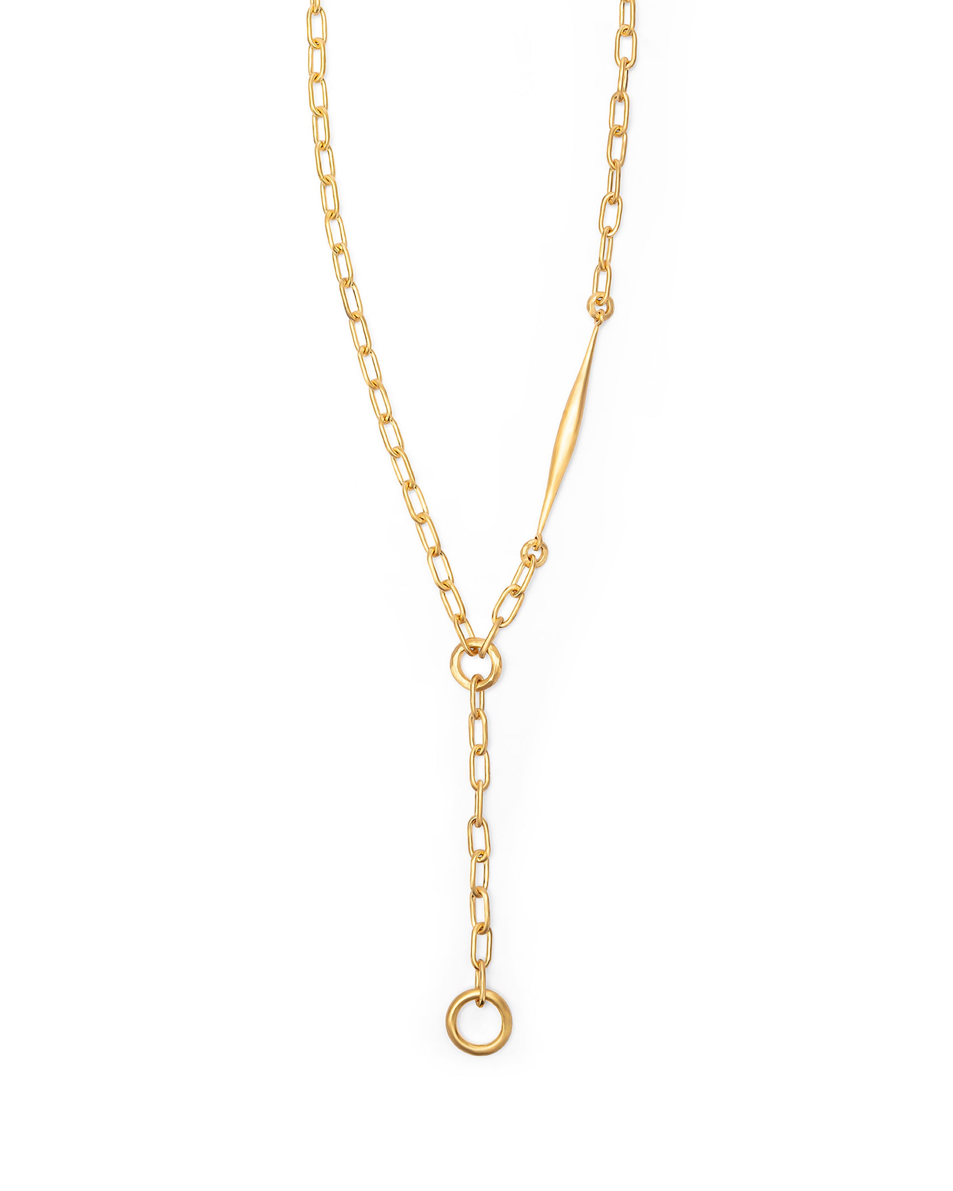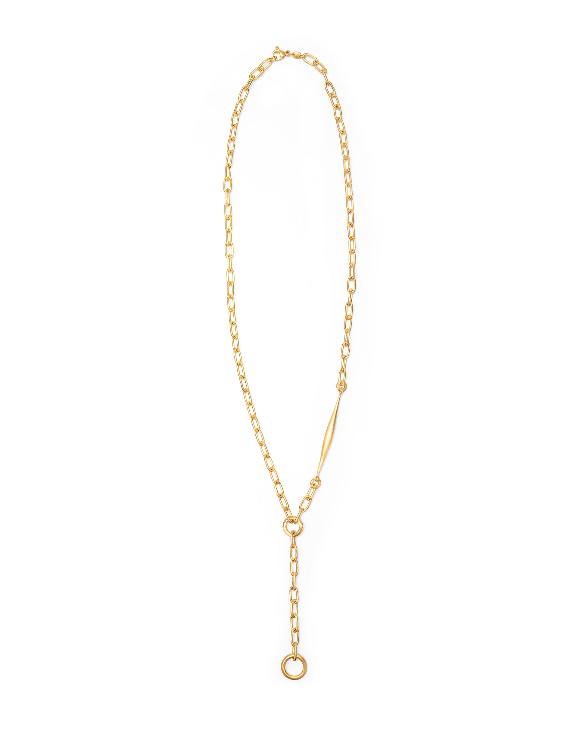 Spindle Necklace Round Chain showcases a bold Y silhouette, enhanced by a side spindle motif. A timeless symbol of feminine creativity and strength, the spindle is reimagined as a sleek, contemporary form, hand-shaped to embody tenacity, and resilience. A celebration of artisanal heritage and modern vision, finished with a faceted central oval link and charm holder. Style it your way, clean or full of playful charms. 100% Handmade in Italy.