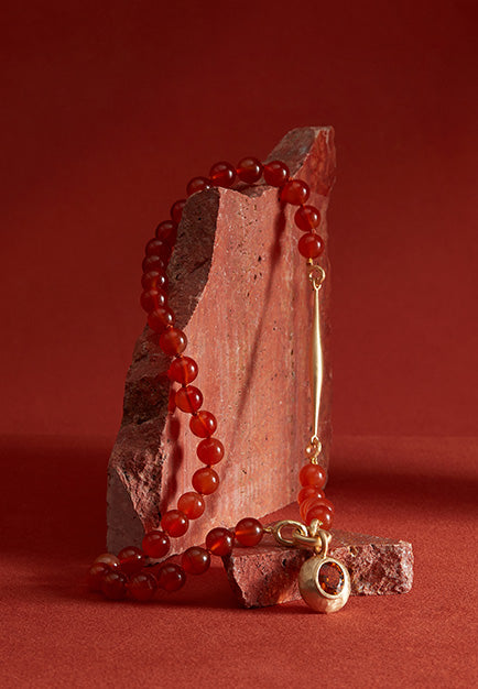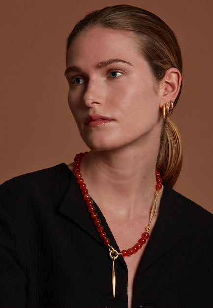 Venture Necklace with Spindle combines classic elegance with an adventurous aesthetic. Polished Natural Carnelian boules in rich orange tones stimulate physical energy and boost motivation. The spindle motif adds a striking impact, finished with a bold charm holder, ready to be styled with multiple charms. A versatile jewel to wear and play with around your neck. 100% Handmade in Italy.