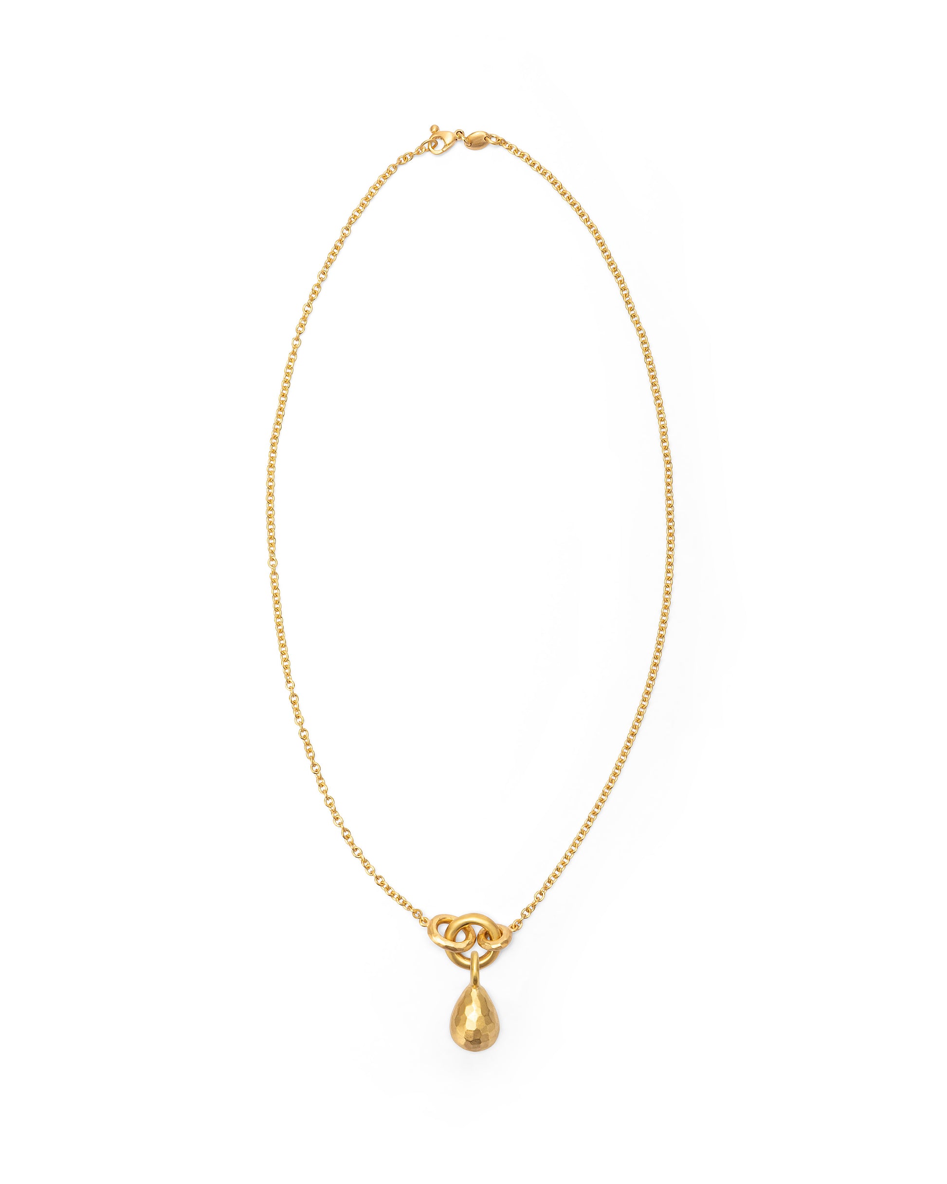 The Voyage Necklace with Light Chain features a delicate and distinctive silhouette, crafted with oval and round links and finished with a bold charm holder ring. It’s paired with the Drop Charm Large, a striking pear-shaped piece with an artisanal faceted finish. Inspired by the symbolism of water and life, it reflects a connection to nature and the spirit of exploration. Wear it solo or mix with other charms to make it your own. 100% Handmade in Italy.