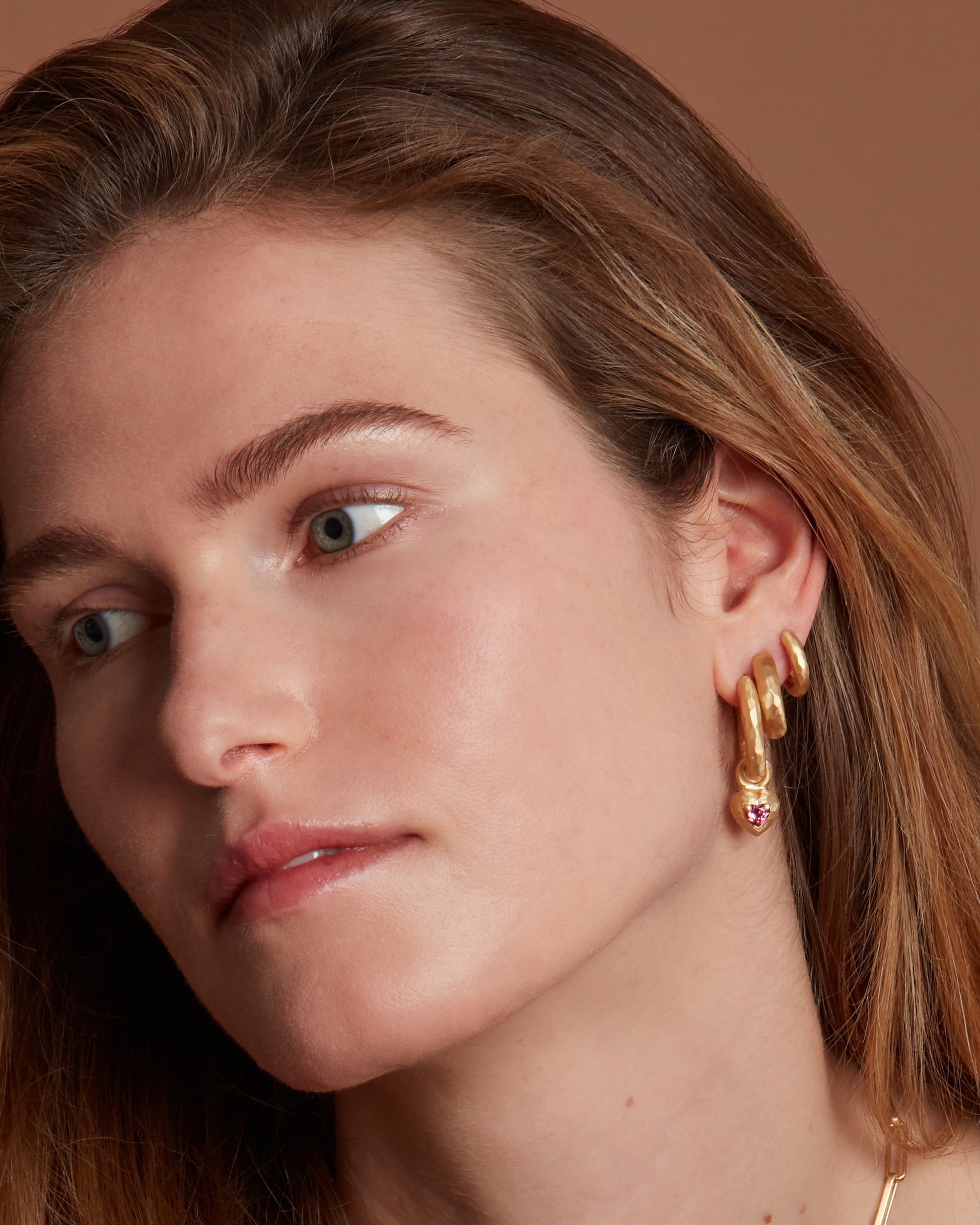 A meaningful duo that celebrates love, strength, and elegance. The Wander Hoops are matched with Heart Charms, set with 0.8 ct. of Natural Pink Tourmaline. A captivating gem that promotes kindness and self-love. 100% Handmade in Italy.